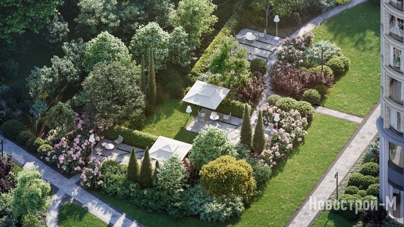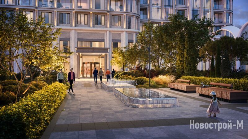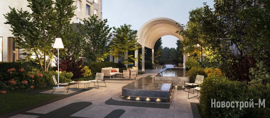 Закрытый внутренний двор будет обустроен в стиле итальянского романтизма. Половину его площади (0,9 га) отведут под озеленение: высадят деревья, кустарники и разобьют лужайки. Внутреннюю территорию украсят фонтаны. Здесь разместятся галерея, зеленые кабинеты, событийная площадь, лаунж-зоны, детская и спортивная площадки.