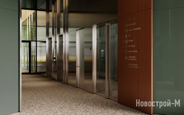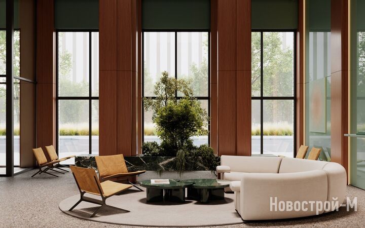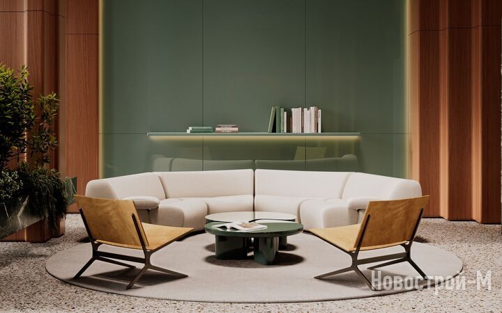 В лобби разместятся зоны ожидания с мягкой мебелью, помещения для почтовых ящиков и посылок, колясочные.