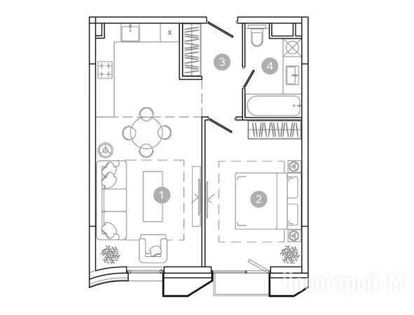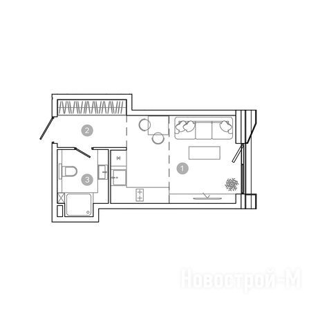 Планировки студий достаточно однообразны, такие квартиры отличаются только площадью. В «евродвушках» (с одной спальней и кухней-гостиной) есть ниши в прихожей, планировки таких квартир — линейные и угловые, причем углы — закругленные.