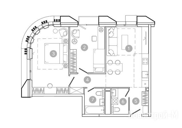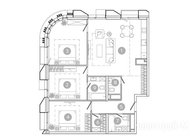 В «евротрешках» имеются два санузла и ниша в прихожей. В квартирах с тремя спальнями и кухней-гостиной также предусмотрены по два санузла, есть мастер-спальни. Планировки — линейные и угловые с закругленными углами.