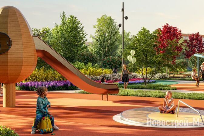 Внутренняя территория ЖК будет закрыта от машин и доступа посторонних. Это будет приватное пространство с современными детскими и спортивными площадками, местами для прогулок и спокойного отдыха. Концепцией «парк во дворе» также предусмотрено комплексное озеленение территории.