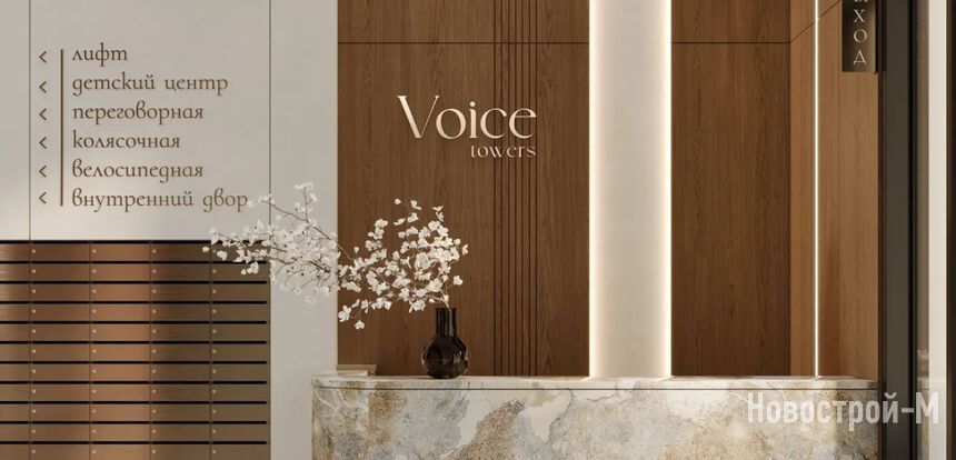 В ЖК VOICE запроектировано гранд-лобби с дизайнерской отделкой и потолками до 8 метров по проекту дизайн-студии BALCON. Это будет просторное помещение с эксклюзивной мебелью, декором и светильниками. В отделке будут использованы теплые бежевые и песочные тона, сочетания природных фактур дерева, керамогранита и бетона. В лобби жители комплекса смогут воспользоваться консьерж-сервисом, выпить кофе, пообщаться с соседями. Также на первых этажах запроектированы гостевые санузлы и помещения для временного хранения колясок и другого детского транспорта.