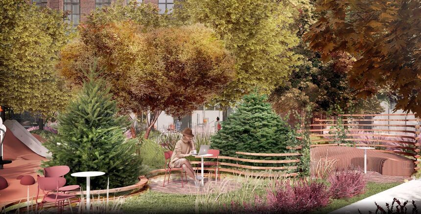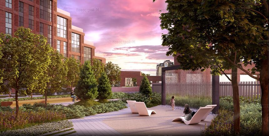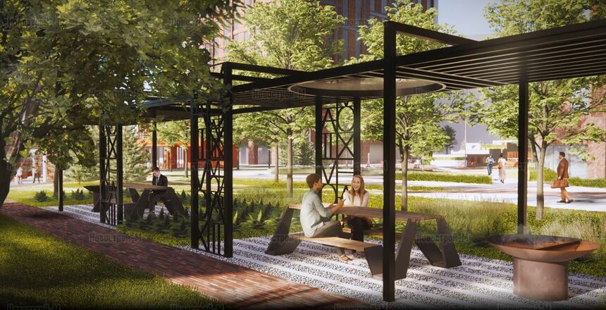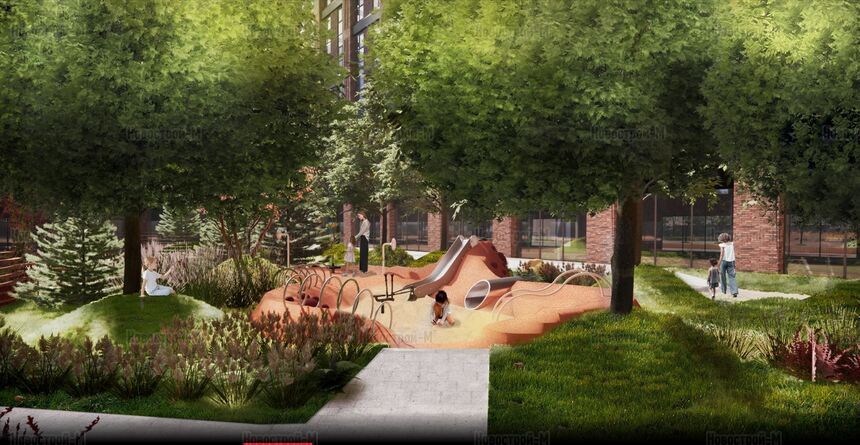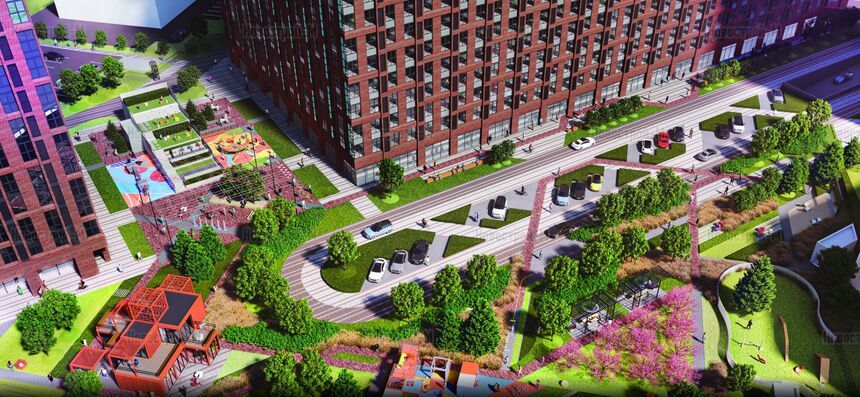 Жилые корпуса образуют закрытое безопасное пространство. Здесь будет реализована концепция «двор без машин», предусмотрены озеленение и ландшафтный дизайн, детская развивающая площадка с интерактивной зоной, а также установка спортивных тренажеров.