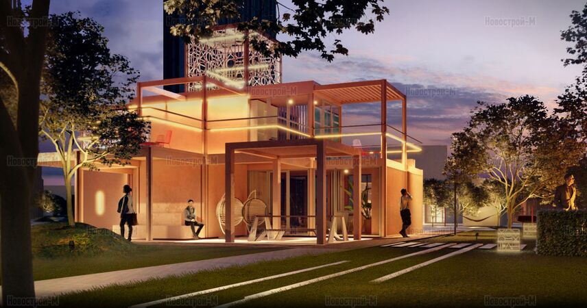 Во дворе разместится многофункциональный павильон, где можно будет отдохнуть на удобных скамейках, полежать в гамаке, любуясь оранжереей с «зеленой стеной», или поработать на свежем воздухе. В прохладное время года комфортную атмосферу и тепло обеспечит биокамин. Территория двора будет красиво подсвечена с помощью дизайнерских торшеров и неонового света, поэтому и в вечернее время во дворе будет не скучно.