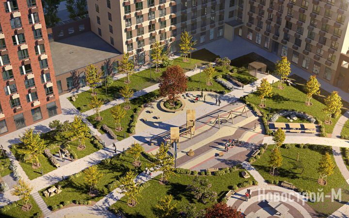 Дома ЖК образуют кварталы, внутри которых находятся закрытые от машин и посторонних дворы. В этом внутреннем пространстве разместятся места для отдыха – застройщик планирует уделить большое внимание озеленению территории – и детские площадки.