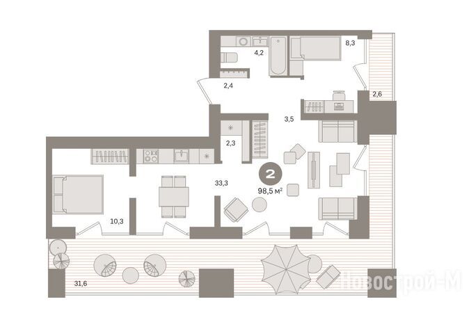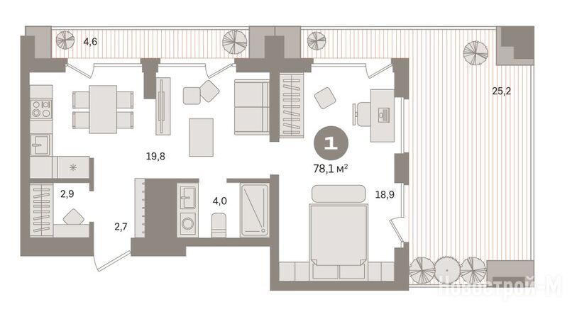 К чести застройщика, он не называет квартиры с 1 спальней и большой кухней «евродвушками». Есть, например, планировка с одной спальней площадью 8,7 кв. м – и кухней 20 «квадратов», а есть 16-метровая кухня и спальня площадью более 22 кв. м – но в ней еще выделено пространство под кабинет, и скорее это уже можно называть «двушкой», особенно с учетом общего метража почти 69 кв. м. но в шахматке такие планировки все равно называются 1-спальными.