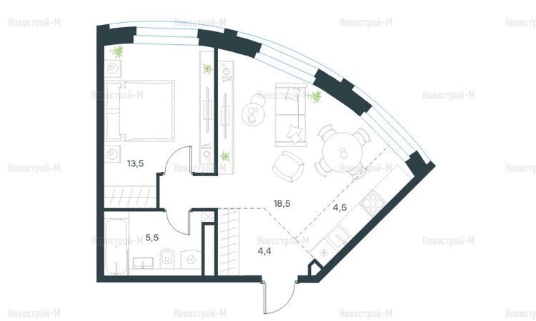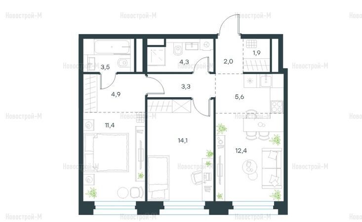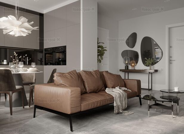 Минимальная площадь студии составляет 21 кв. м, при этом даже в таких небольших помещениях будет два полноценных окна. Самая большая квартира достигает площади в 119 кв. м — это 5-комнатная «евро» с просторной кухней-гостиной.