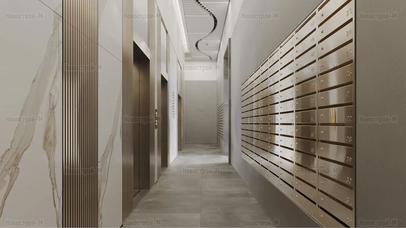 Дизайн входных групп разрабатывали в бюро ALAMO. Во внутреннем оформлении находит продолжение идея связи зданий с локацией: плавные линии как отсылка к речным волнам, природные оттенки и рисунок камня на стенах, металлические элементы, которые поддерживают уникальный световой сценарий. Для отделки МОП будет использован керамогранит, металл и декоративная штукатурка. Площадь лобби составит от 44 до 71 кв. м, в них разместятся стойки ресепшн, зоны ожидания с дизайнерской мебелью, гостевые санузлы, лапомойки, почтовые ящики. Сквозные входные группы позволят жителям напрямую проходить во внутренний двор из любого корпуса.