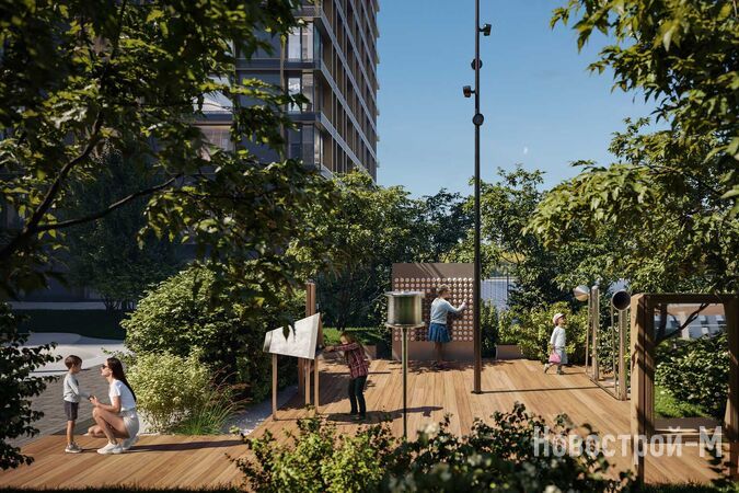 Детские площадки оснащены современным игровым оборудованием и расположены таким образом, чтобы взрослые могли приглядывать за детьми и при этом заниматься своими делами — пить кофе, общаться с соседями, заниматься спортом. Детская площадка имеет сложный рельеф и мягкое резиновое покрытие, в качестве декора использованы фигуры, созданные художницей Машей Сомик.