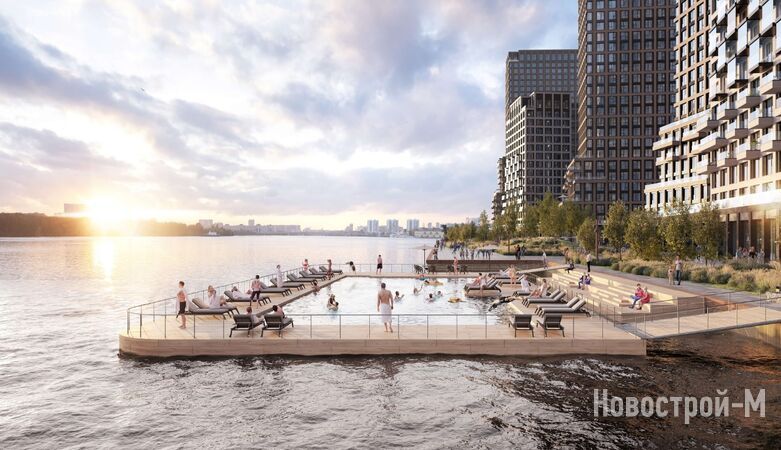 В приватных дворах разместятся сады со столиками, гамаками и детскими площадками для разных возрастов, на набережной запланированы детские водные аттракционы, спортивная площадка, велодорожка, понтонный бассейн, лес с арт-объектами, променады, марина для яхт и катеров.