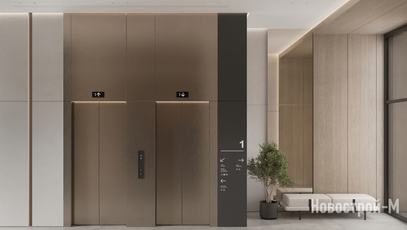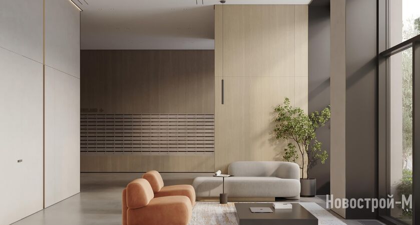 Площадь главного лобби — 460 кв. м. Предусмотрены лаундж-зоны с мягкой мебелью и розетками для зарядки гаджетов, коворкинг, круглосуточный ресепшн, колясочные, гостевые санузлы, лапомойки, велопарковка. Для автомобилей — подземный паркинг и гостевая стоянка. На подземном уровне имеются кладовые.