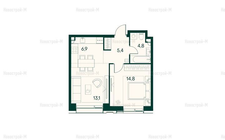 Самыми компактными являются однокомнатные квартиры. Все они имеют полноценную кухню-гостиную и спальню. Можно выбрать квартиру с балконом.