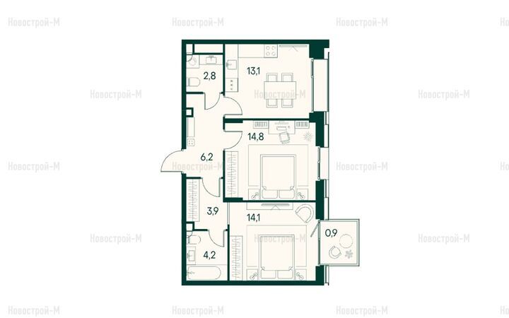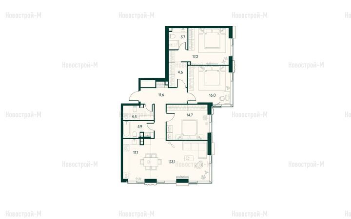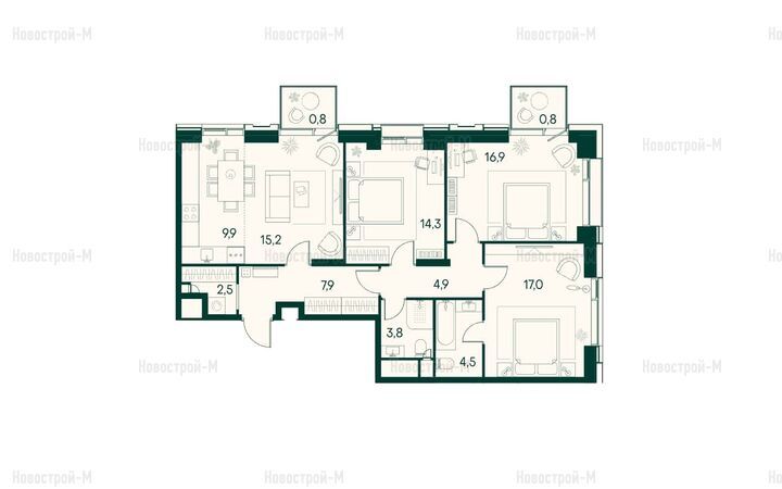 Квартиры с 2–4 спальнями могут иметь линейную, угловую, распашную или улучшенную планировку. Площадь двухкомнатных — от 60 до 102 кв. м, трехкомнатных — от 85,3 до 135 кв. м, четырехкомнатных — от 100 до 144 кв. м.
