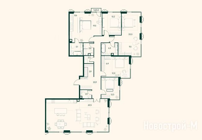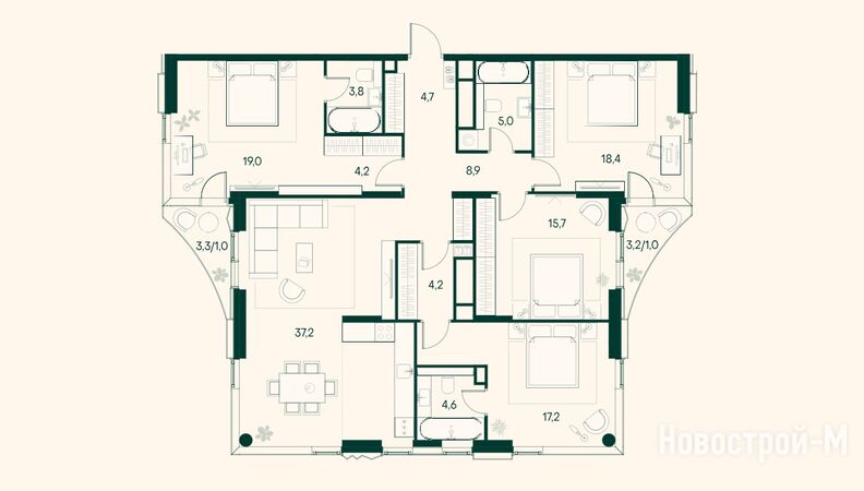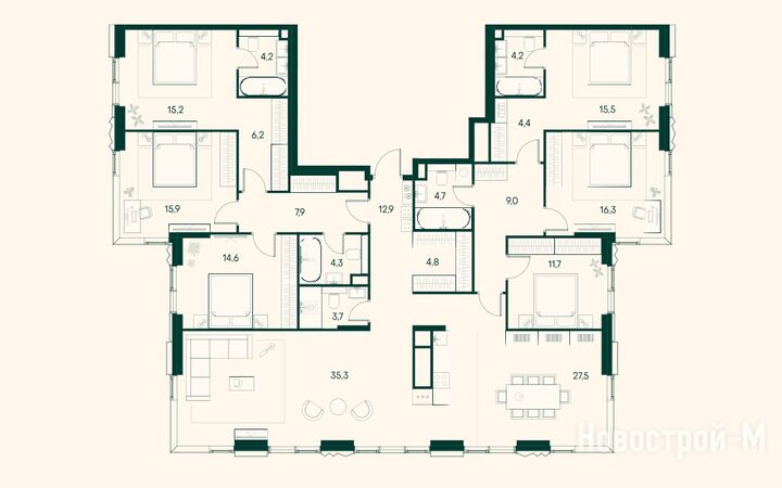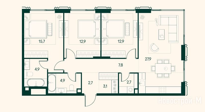 В каждой 3-комнатной квартире есть две или три спальни (в том числе мастер-спальни) и кухня-гостиная, в некоторых планировках — гардеробные, террасы.