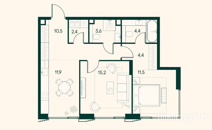 В 1-комнатных квартирах предусмотрены большие кухни — обычные и кухни-гостиные. В некоторых планировках есть мастер-спальни и гостевой санузел, гардеробные, балконы, террасы или патио, двухуровневые варианты.