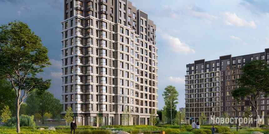 Проект представлен монолитными домами переменной этажности от 9 до 14 этажей. Фасады выполнены в природных оттенках с использованием бетонной плитки, металлических кассет и керамогранита. Для кондиционеров предусмотрены декоративные корзины.