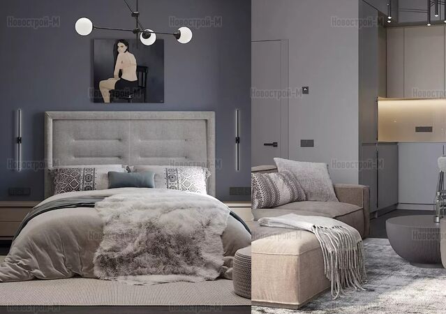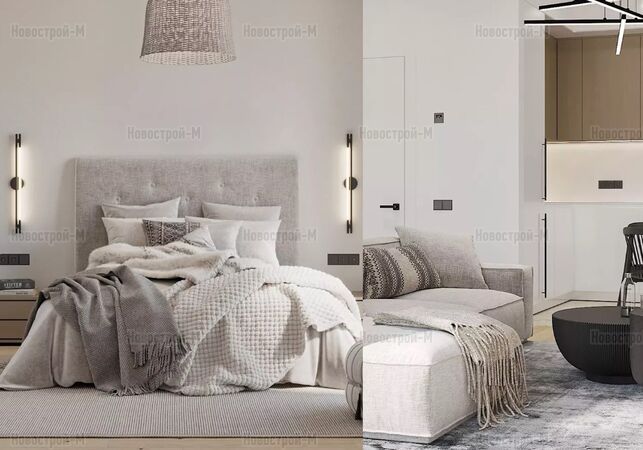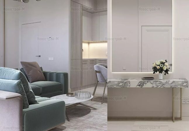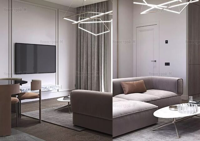 Квартиру можно купить как с ремонтом, так и без него. На выбор предлагается 3 стиля отделки в более светлых или темных вариациях: New Classic светлая и темная (сдержанная и элегантная классика с характерными молдингами на стенах), Scandinavian (приглушенные тона северной природы).