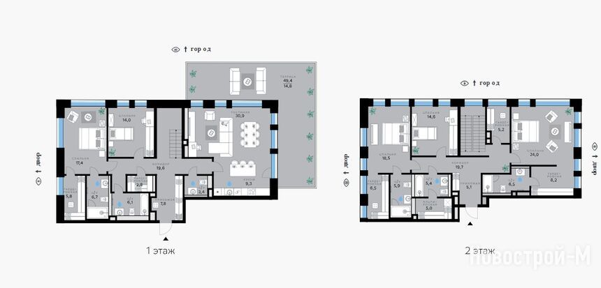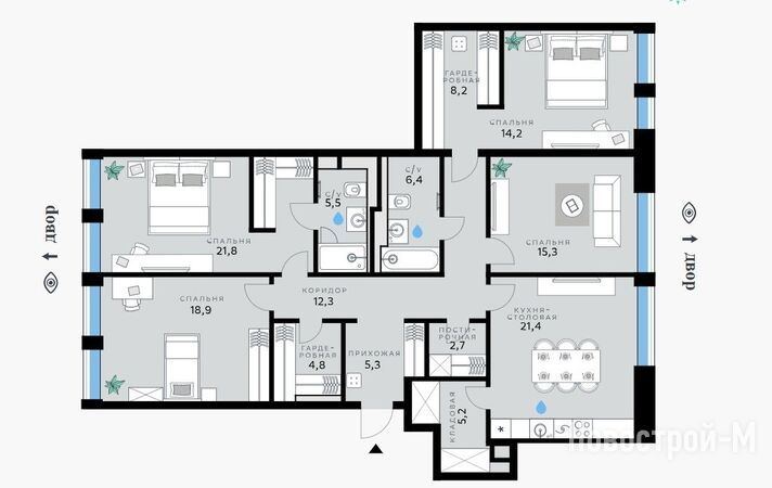 Площадь квартир с двумя спальнями — от 65,9 до 90,3 кв. м. Трехкомнатных — 67,5–139,4 кв. м. Четырехкомнатные варианты — 142-167 кв. м, таких планировок в реализации совсем не много, как и многокомнатных: в продаже находится одна двухуровневая квартира метражом 263,2 кв. м.