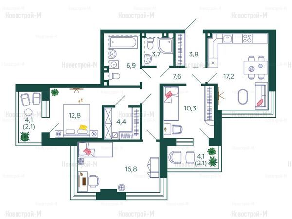Изучить планировки более подробно вы можете на поэтажных планах в карточке проекта на сайте Новострой-М. Там же доступна информация о том, на какую сторону света будут выходить окна вашей будущей квартиры.