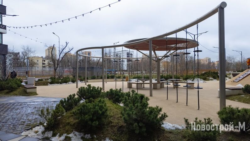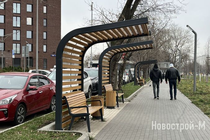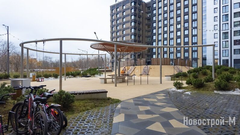 Также в проекте заявлен парк площадью 3 га (правда, из описания на сайте не совсем ясно, включает ли эта цифра площадь дворов). На момент посещения проекта мне удалось лично увидеть аллею с эко-скамейками вдоль Окской улицы, березовую рощу, несколько беседок, площадку для выгула собак.
