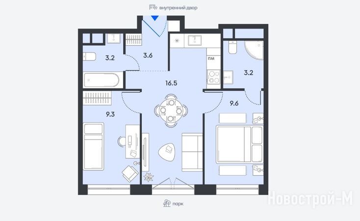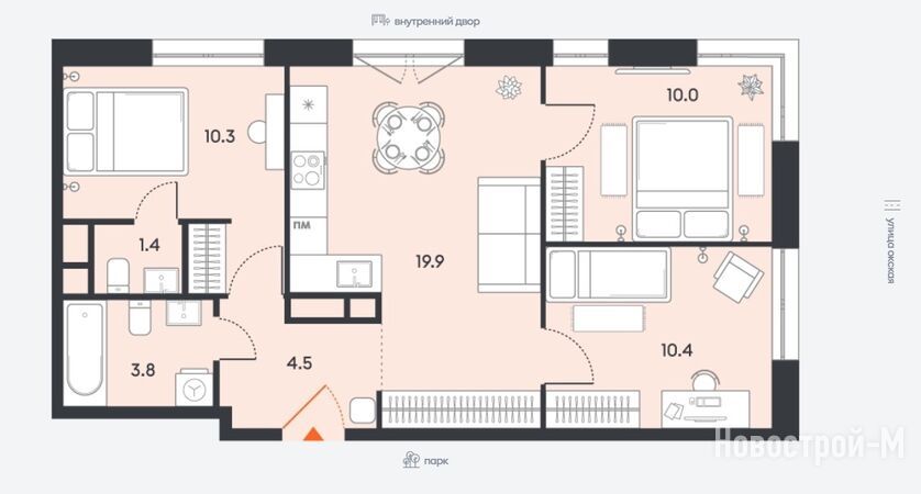 Среди вариантов можно выбрать квартиру с французским балконом и гардеробной (есть во всех типах планировок), с мастер-спальней (в 2–3-комнатных лотах), с угловым остеклением и несколькими ванными комнатами (есть в некоторых двушках и трешках).