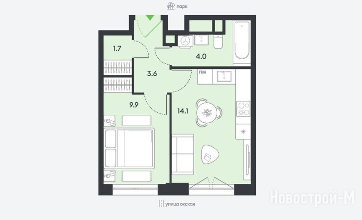 Все планировки – «честный евроформат»: кухня больше, чем каждая из спален, спальни считаются отдельно (то есть в «двушке» – две отдельные спальни и кухня-гостиная). Несмотря на наличие 1-комнатных метражом менее 30 кв. м, они не студийного типа – на планировке обозначена капитальная перегородка между кухней и комнатной.