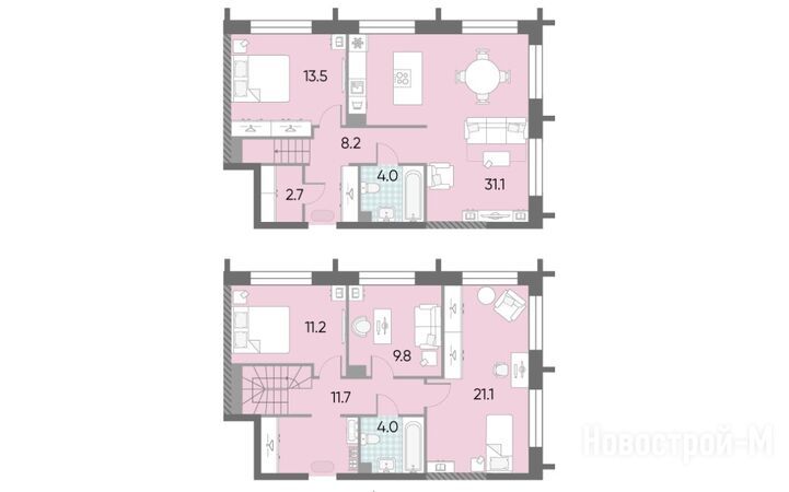 4-комнатные планировки пока реализуются только в корпусе «Спарк». Все они двухуровневые, с санузлами на каждом этаже. Однако при общей большой площади (от ста «квадратов») спроектированы спальни по 11–14 кв. м, узкие прихожие и тесные ванные комнаты.