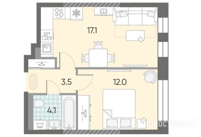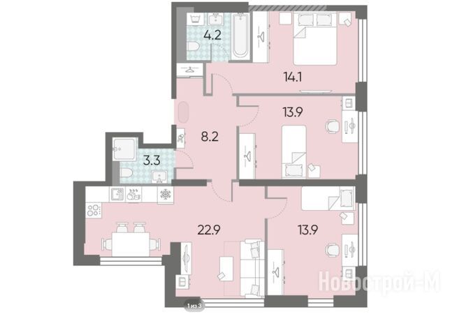 «Трешки» представлены в корпусах «Спарк» и «Марк». Во всех по два санузла, однако нет отдельных постирочных/кладовых. И в целом даже при довольно большой площади холлов, кажется, что там будет слишком мало места для размещения полноценного шкафа-купе на большую семью. Скругленные окна в гостиной выглядят стильно, однако сильно сужают возможности для перепланировки или расстановки мебели.