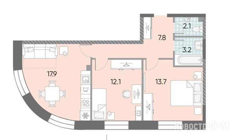 Двухкомнатные – все евростандарта (с большой кухней), при этом кухня не заменяет собой еще одну комнату, то есть к кухне прилагаются еще две спальни либо одна спальня и кабинет. В «Гранде» один раздельный санузел, в остальных очередях уже спроектированы по два санузла и можно найти варианты с мастер-спальней. В «Марке» есть планировки с угловым остеклением, а в «Спарке» – например, с тремя окнами в гостиной.