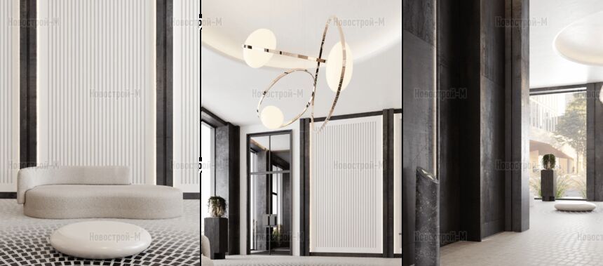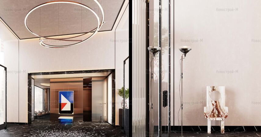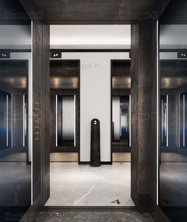 В отделке лобби предпочтение также отдано натуральным материалам: камень, стекло, металл. Сочетание фактур в центральном лобби, крафтовые элементы освещения, панно в авангардистском стиле придают помещениям изысканный вид и роскошь.