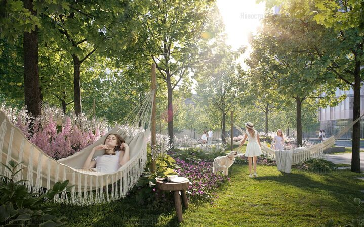 Через всю территорию ЖК Symphony 34 будет проложен пешеходный бульвар. Больше половины площади дворов отведены под зеленые насаждения и ландшафтный дизайн, деревья и кустарники разделяют территорию комплекса на функциональные зоны: для спокойного отдыха (в том числе – площадка для пикника и секретный сад в японском стиле с небольшим прудом), детские игровые комплексы и спортивные площадки. На всей территории ЖК будет работать сеть wi-fi.