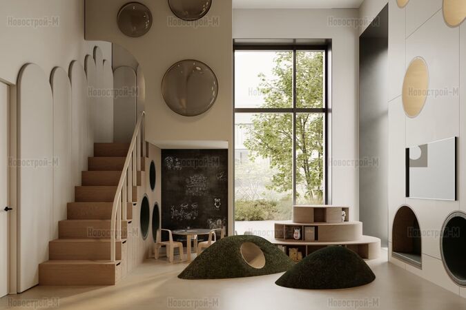 Детская комната — это двухъярусное пространство, где родители с детьми могут провести время, если погода не позволяет отправиться на прогулку. Пространство оформлено в светлых натуральных тонах и укомплектовано всем необходимым для детских игр. Здесь есть скалодром, грифельная доска и антресоли.