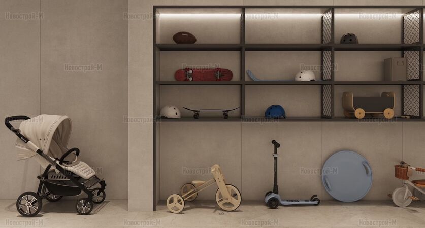 У второй секции расположены функциональные помещения: колясочная, где можно хранить не только коляски, но и самокаты и скейтборды, комната для мытья лап собак и санузел. Рядом со служебным входом есть зона для удобного и безопасного хранения велосипедов.