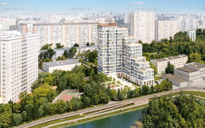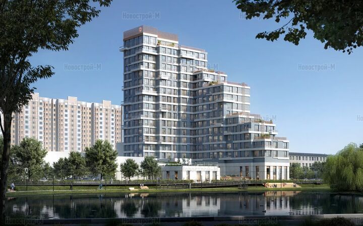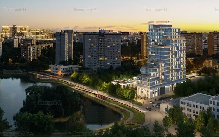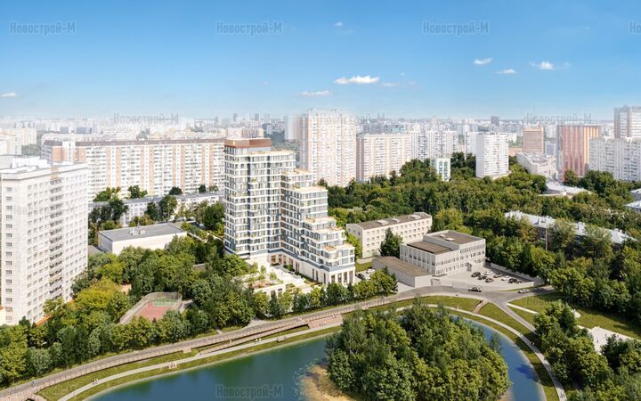 За разработку архитектурной концепции клубного дома взялось московское бюро NOWADAYS office. Перед архитекторами стояла задача органично вписать новый объект в существующий городской и природный контекст. Так появилось компактное 16-этажное здание ступенчатой формы, спускающееся к самому пруду.