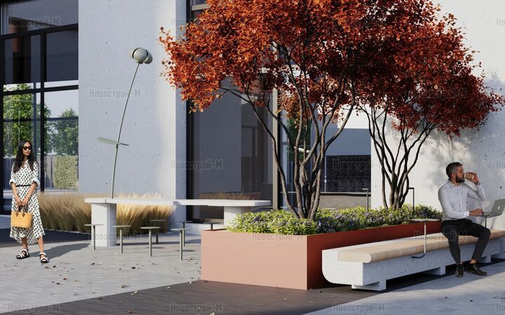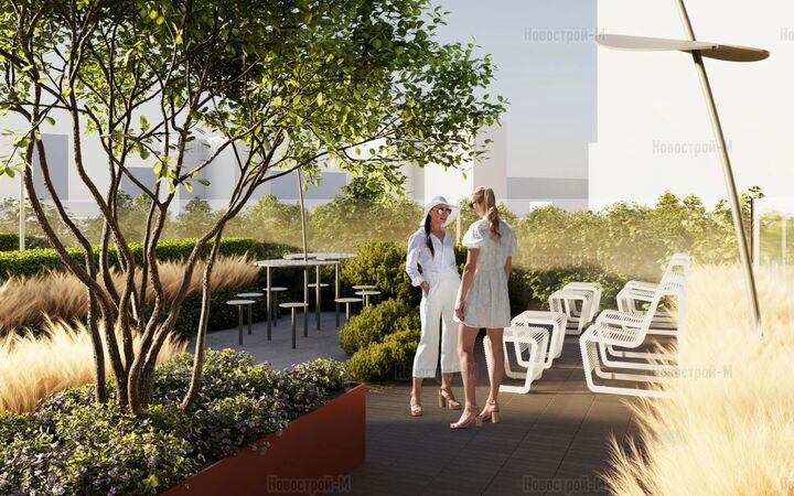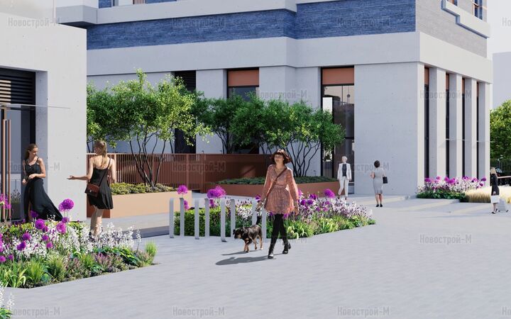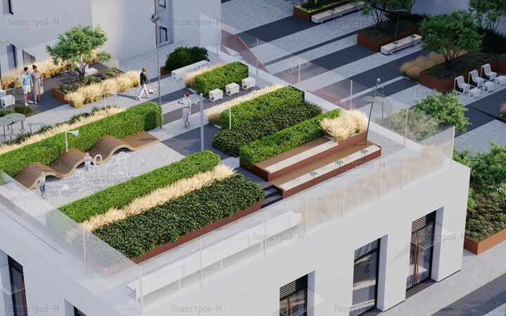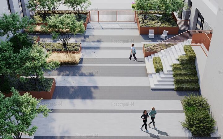 «Парящий дворик» имеет спуск к пруду, оформленный в виде амфитеатра. По нему можно спуститься в парк на пробежку или прогулку с коляской.