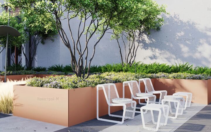 Во дворике появятся дизайнерская мебель и светильники в форме водяных лилий, которые подчеркнут близость к природе.