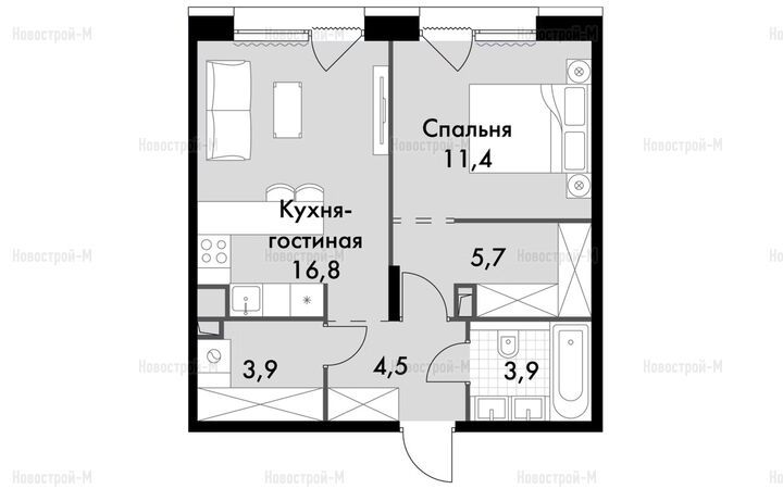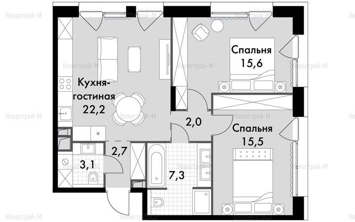 В проекте есть квартиры с разным числом спален: от одной до четырех. Площадь однокомнатных квартир с большой кухней-гостиной от 44 до 49 кв. м. Средняя площадь двухкомнатных квартир — 68–69,4 кв. м, трёхкомнатных — 65–83,7 кв. м.