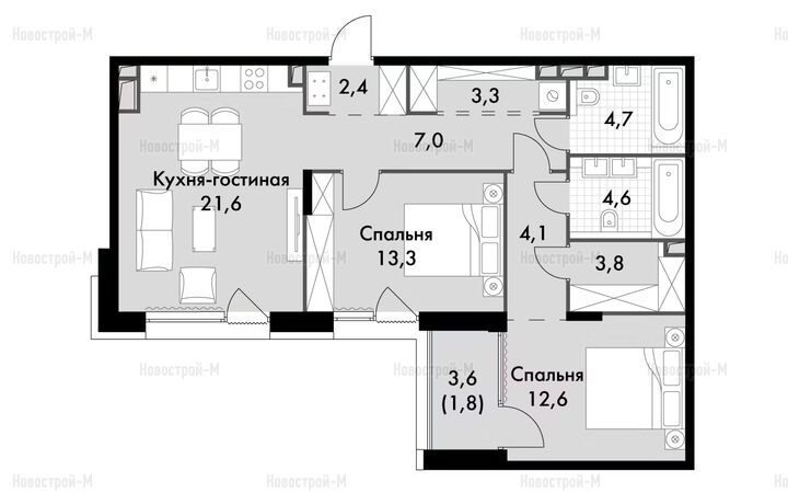 Квартиры площадью более 100 кв. м представлены без отделки.