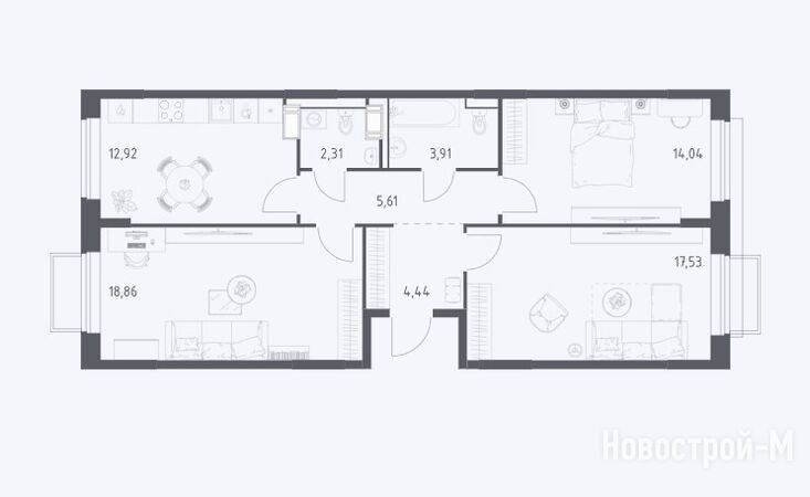 Площади «трешек» в продаже – от 69 до 82 кв. м. Все они распашного или углового типа, но варианты с двумя балконами единичны. Кроме того, в них нет мастер-спален (вход в ванную подразумевается только из коридора). Возможно, при желании можно сделать перепланировку и организовать мастер-спальню, однако дополнительный санузел слишком компактный (1,5-2 кв. м), и в него не поместится даже душевая кабина.