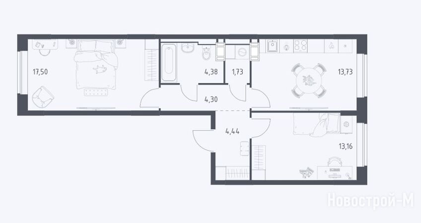 Двухкомнатные квартиры имеют площадь от 50,9 до 59,9 кв. м. Здесь уже можно выбирать и угловые планировки, и, при желании, распашные. Санузлы раздельные, в самых просторных лотах появляются гардеробные либо сочетания: совмещенный санузел и постирочная.
