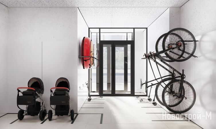 Для удобства жителей в лобби будут комнаты для хранения колясок и велосипедов, стеклянные входные группы, сквозь которые отлично видно, что происходит на улице и в подъезде.