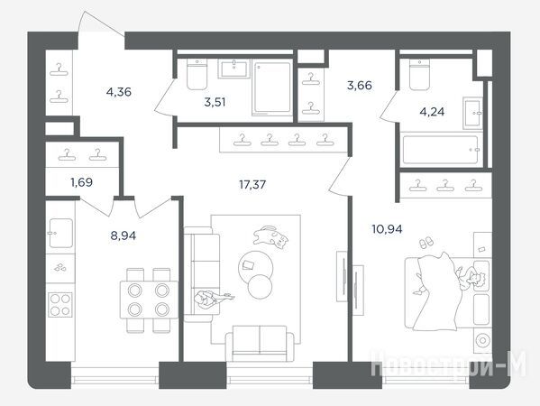 Самый доступный вариант в имеющемся предложении – студия площадью 29,14 кв. м. Приобрести ее можно по скидке за 18,4 млн рублей. Скидка действует при 100%-ой оплате или ипотеке без субсидирования. Без скидки квартира стоит 19,8 млн рублей.