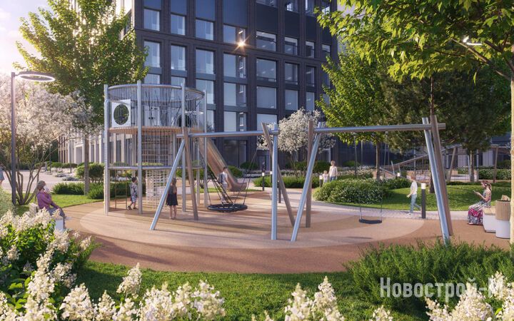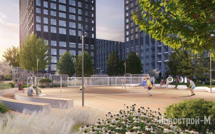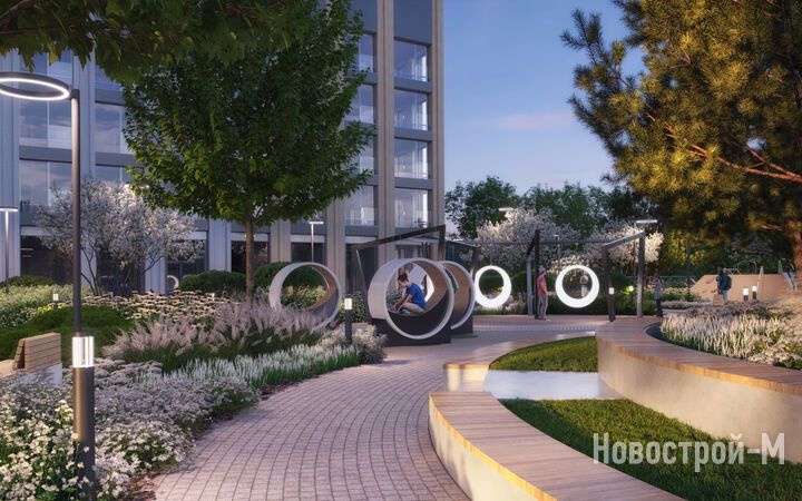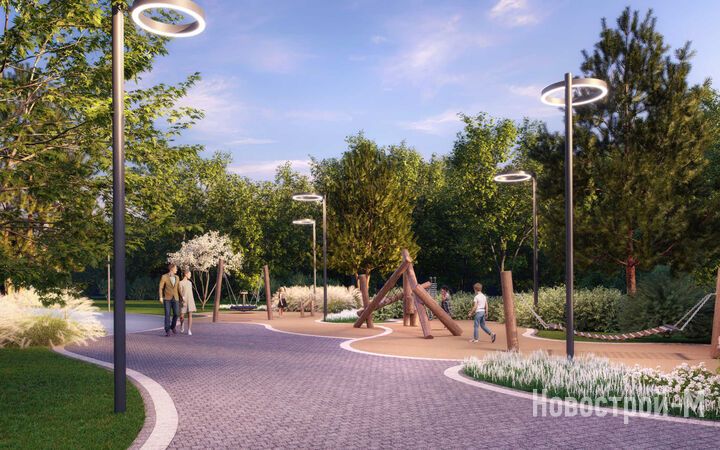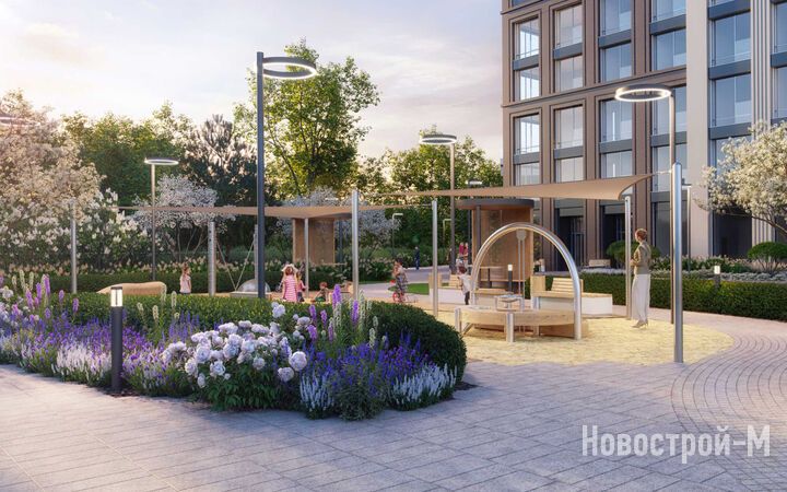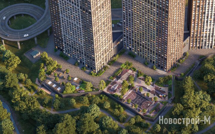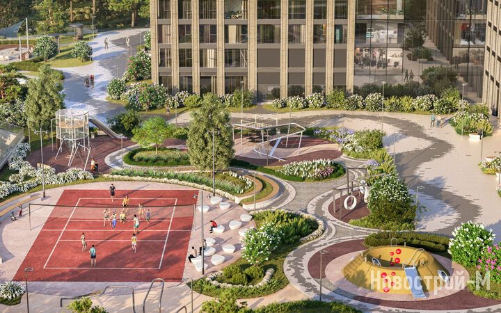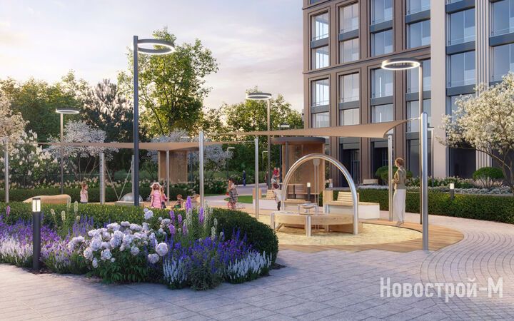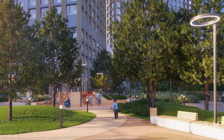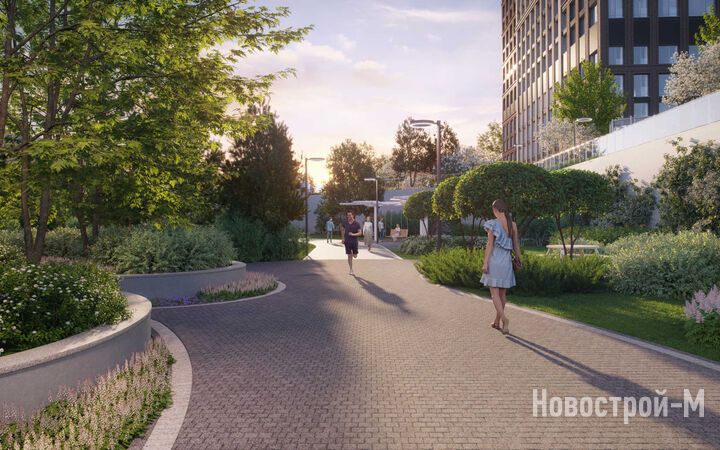 Площадь застройки – 8,8 гектара, из которых 2 гектара отведено под двор-парк с выходом к реке Раменке. Территория двора будет закрыта от машин и посторонних, здесь появятся 10 разнообразных зон для досуга детей и взрослых: набережная для прогулок, зона отдыха с перголами, качели, воркаут, детские игровые комплексы, спортивные площадки, в том числе для командных игр, велодорожки, оранжерея, а также велопарковки с навесами и площадка для выгула собак.