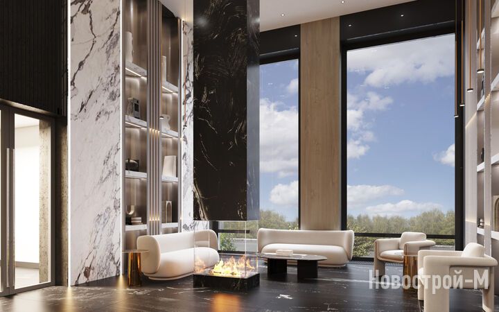 У каждой башни будет собственное лобби площадью от 106 до 135 кв. м. с потолками высотой 5 м. Дизайн общественных пространств в стиле фьюжн разработан командой бюро Blanc Architects. Пространство сочетает в себе эстетику и функциональность. Здесь можно поработать в спокойной обстановке, провести вечер в мягкой зоне у камина, общаясь с гостями или соседями, решить бытовые вопросы на стойке ресепшн. В отделке лобби использованы премиальные материалы, в том числе натуральный камень. Атмосфера домашнего уюта создается за счет освещения и декора.