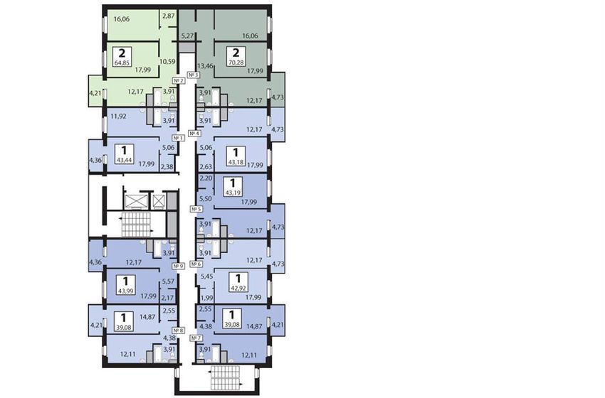 Сильно огорчило наличие коридорных секций с большим количеством квартир на этаже. Самодельные тамбуры в ближайшее время серьезно нарушат пожарные требования по эвакуации. А вот секции с четырьмя квартирами на этаже вполне неплохие, особенно если учитывать, что у некоторых есть естественный свет в подъезде.