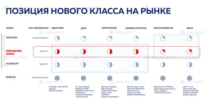 Пока мы относим к прагматик-классу наши уже реализованные жилые комплексы «Люберцы 2015», «Люберцы 2016», «Октябрьский 2016», «Внуково 2016», «Внуково 2017», «Люберцы 2017», первую очередь ЖК «Пригород Лесное», строящиеся проекты «Люберцы 2018», вторую очередь ЖК «Пригород Лесное», «Томилино 2018», «Химки 2019», «Остафьево» и будущие проекты. По нашим оценкам, доля прагматик-класса в сегменте массового жилья в Московском регионе составит к концу 2018 года более 23%. При этом мы совершенно не против того, чтобы другие застройщики подключались и также строили жилье, которое можно будет отнести к прагматик-классу.