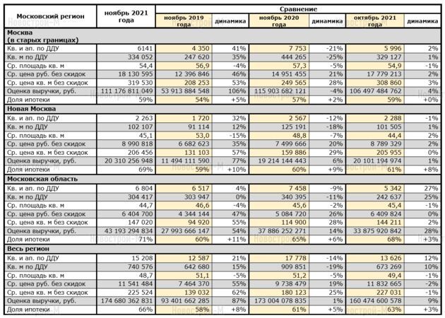 По всему Московскому региону суммарный объем ноябрьских продаж новых квартир и апартаментов вырос на 87% по сравнению с аналогичным периодом 2019 года и составил 174,7 млрд рублей. В пересчете на объекты недвижимости рост составил 21%, при этом цена квадратного метра за два года выросла на 62%.