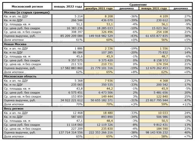 По итогам января 2022 года выручка от розничных продаж квартир и апартаментов в Москве и Подмосковье на 40% превысила выручку за январь 2021 года. При этом цена квадратного метра в сделках по Московскому региону выросла на 23% относительно аналогичного периода прошлого года.