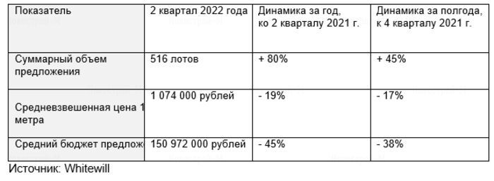 По данным департамента аналитики и консалтинга Whitewill, с июня 2021 года были открыты продажи только в трех таких комплексах и рост обусловлен эффектом низкой базы. При этом выход новых ярких проектов по стартовым ценам и завершение продаж в сданных в эксплуатацию ЖК обусловили уменьшение стоимости экспозиции. На текущий момент средний бюджет предложения сократился до уровня 151 млн рублей.
