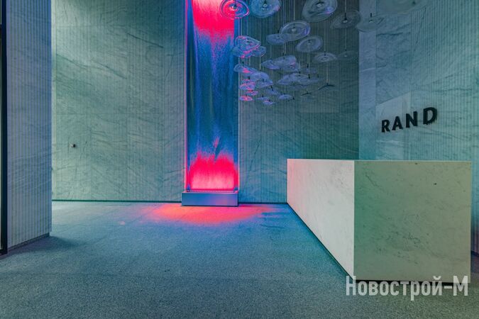 «Живой камень придал интерьеру аутентичность. Цвет работает как коды, понятные резидентам. Мы выбирали оттенки, которые редко встречаются в интерьерах, и особое внимание уделяли рисунку прожилок, который подчеркивает подлинность природного происхождения. Лаконичная модернистская форма и умеренность в количестве предметов мебели помогают сохранить чистоту линий и архитектурного объема, а также усилить монументальность оформления групп ресепшн», — прокомментировали авторы проекта, бюро Kleinewelt Architekten.